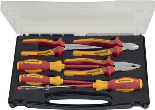VDE isoliert, bis 1000 V · bestückt mit hochwertigen Werkzeugen Inhalt: 1 St. Seitenschneider 160 mm VDE-isoliert, Griffe mit ergonomischen 2-Komponenten-Hüllen mit Abgleitschutz (Art.-Nr. 40 00 810 158) 1 St. Kombizange 180 mm VDE-isoliert, Griffe mit ergonomischen 2-Komponenten-Hüllen mit Abgleitschutz (Art.-Nr. 40 00 810 241) 1 St. Telefonzange 200 mm VDE-isoliert, gerade, Griffe mit ergonomischen 2-Komponenten-Hüllen mit Abgleitschutz (Art.-Nr. 40 00 810 359) 1 St. Schraubendreher für Schlitzschrauben , VDE-isoliert 4,0 x 100 mm, mit Mehrkomponenten-Kraftheft (Art.-Nr. 40 00 828 516) 1 St. Schraubendreher für Schlitzschrauben VDE-isoliert 5,5 x 125 mm, mit Mehrkomponenten-Kraftheft (Art.-Nr. 40 00 828 517) 1 St. Schraubendreher für Schrauben mit Kreuzschlitz (PH) Gr. 2 VDE-isoliert, mit Mehrkomponenten-Kraftheft (Art.-Nr. 40 00 828 572) 1 St. Phasenprüfer 150 mm · Weitere technische Eigenschaften Griff: 2-Komponenten-Hüllen • Verpackung: Kunststoffkoffer