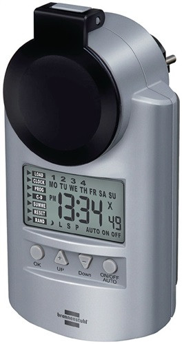 digital · mit Wochenprogramm · auch für den Außenbereich · großes Display für Wochentage, Stundenanzeige wahlweise im 12 und 24 Stunden Format, Anzeige von Minuten und Sekunden sowie der gewählten Betriebsart · 20 Ein-/Aus-Programme mit Wochentag · Stunden- und Minuteneinstellung · einfache 4-Knopf-Bedienung · kürzeste Schaltzeit 1 Minute · Countdown- und Zufallsfunktion · (integrierter NiMH-Akku) · manuelle Ein-/Aus-Funktion · Unterbrechen laufender Programme möglich · Datenspeicher bei Stromausfall · Steckdose mit Kinderschutz und Deckel für Spritzwasserschutz · Schaltleistung max. 3650 W Besondere Produktvorteile: Durch den praktischen Gehäuseaufbau wird bei Schalter-Steckdosen-Kombinationen der Lichtschalter durch das Timergehäuse nicht verdeckt · Weitere technische Eigenschaften Breite: 65mm • Tiefe: 45mm • Höhe: 125mm