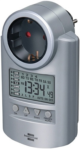 digital · mit Wochenprogramm · für den Innenbereich · großes Display für Wochentage, Stundenanzeige wahlweise im 12 und 24 Stunden Format, Anzeige von Minuten und Sekunden sowie der gewählten Betriebsart · 20 Ein-/Aus Programme mit Wochentag · einfache 4-Knopf-Bedienung · kürzeste Schaltzeit 1 Minute · Countdown- und Zufallsfunktion · Sommer-Winterzeit umschaltbar · manuelle Ein-/Aus-Funktion · Unterbrechen laufender Programme möglich · Datenspeicher bei Stromausfall · Steckdose mit Kinderschutz · Schaltleistung max. 3650 W Besondere Produktvorteile: Durch den praktischen Gehäuseaufbau wird bei Schalter-Steckdosen-Kombinationen der Lichtschalter durch das Timergehäuse nicht verdeckt · Weitere technische Eigenschaften Breite: 65mm • Tiefe: 45mm • Höhe: 125mm
